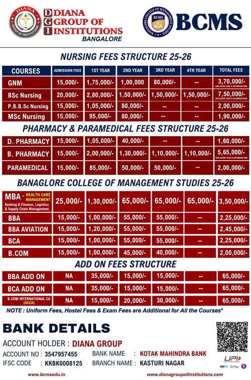 Applicants shall deposit fees through DD/NEFT/ RTGS in favour of “Bangalore College of Management Studies” payable at Bangalore.